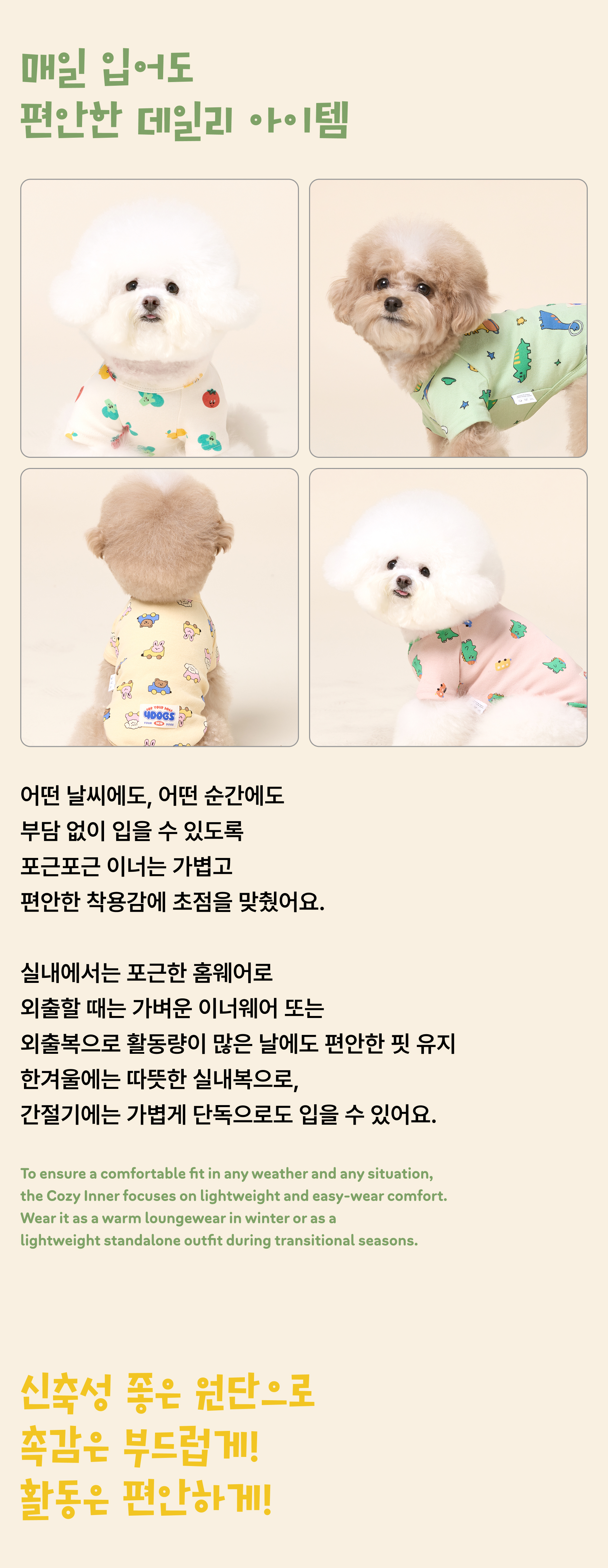 아늑하고 편안한 착용감과 차분한 컬러감, 귀여운 일러스트가 어우러진 실내복