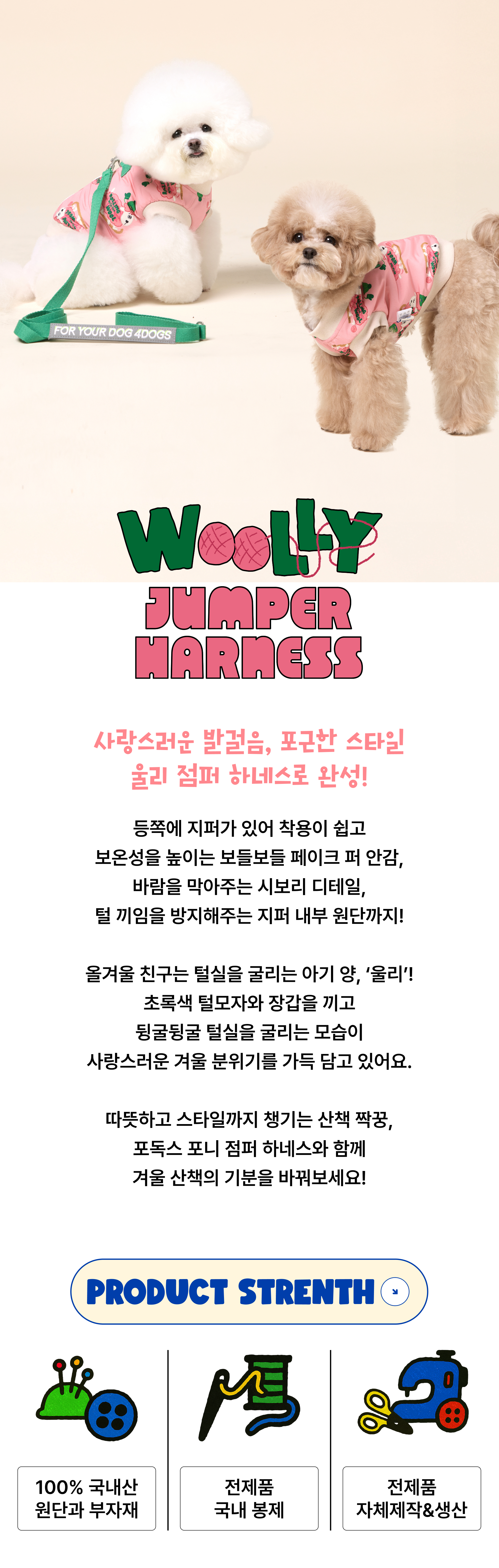 하네스와 점퍼가 결합된 올인원 제품으로 등쪽 지퍼 적용으로 착용까지 간편한 산책 필수품