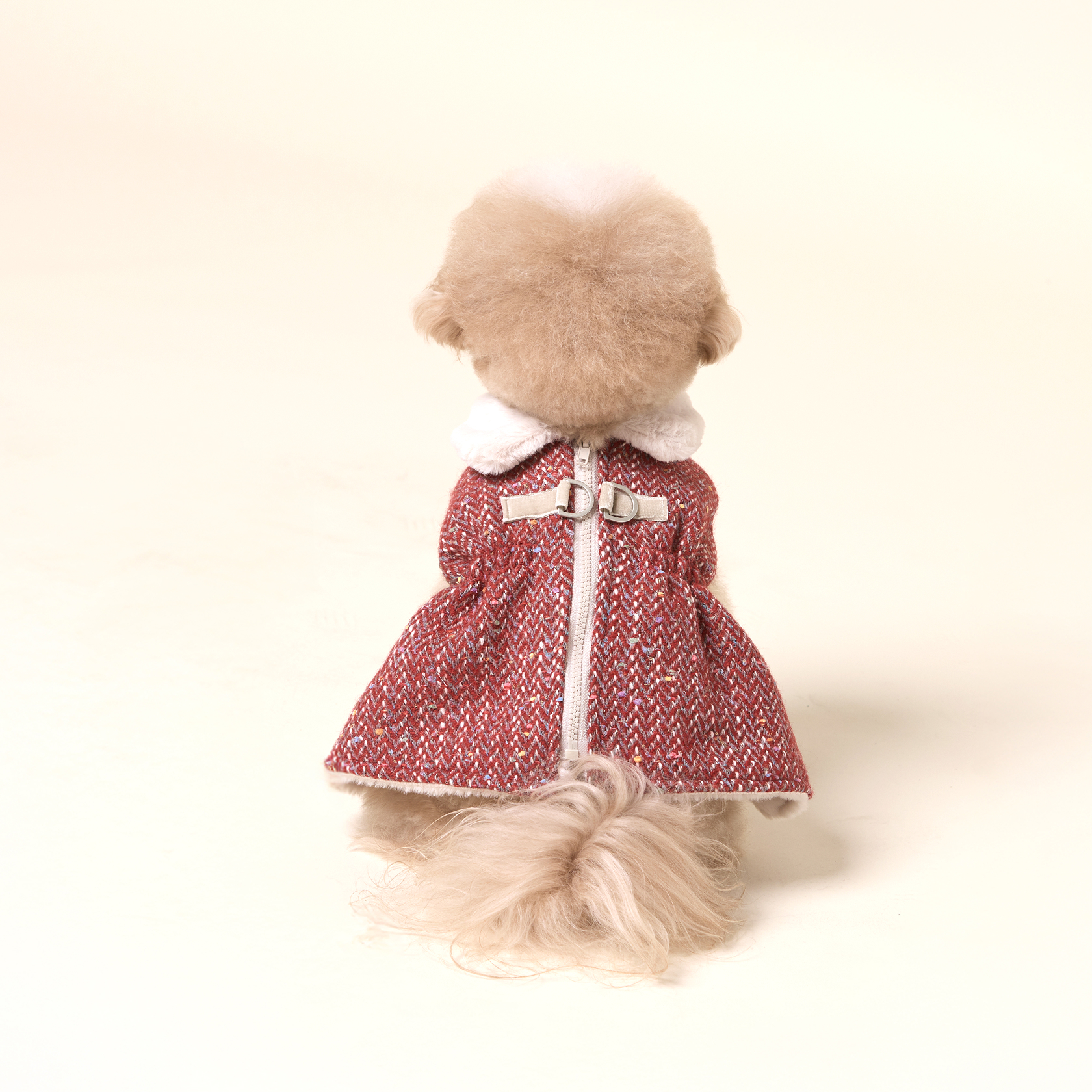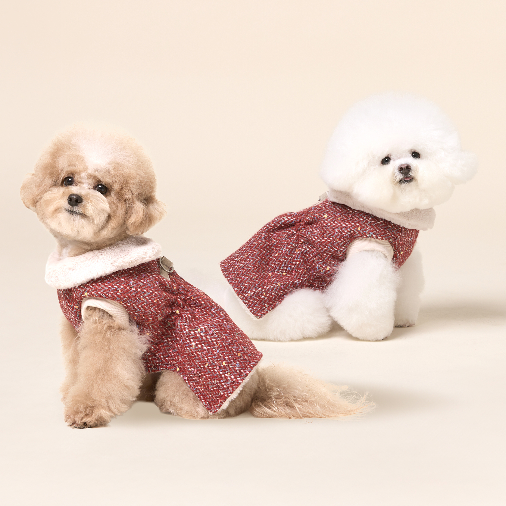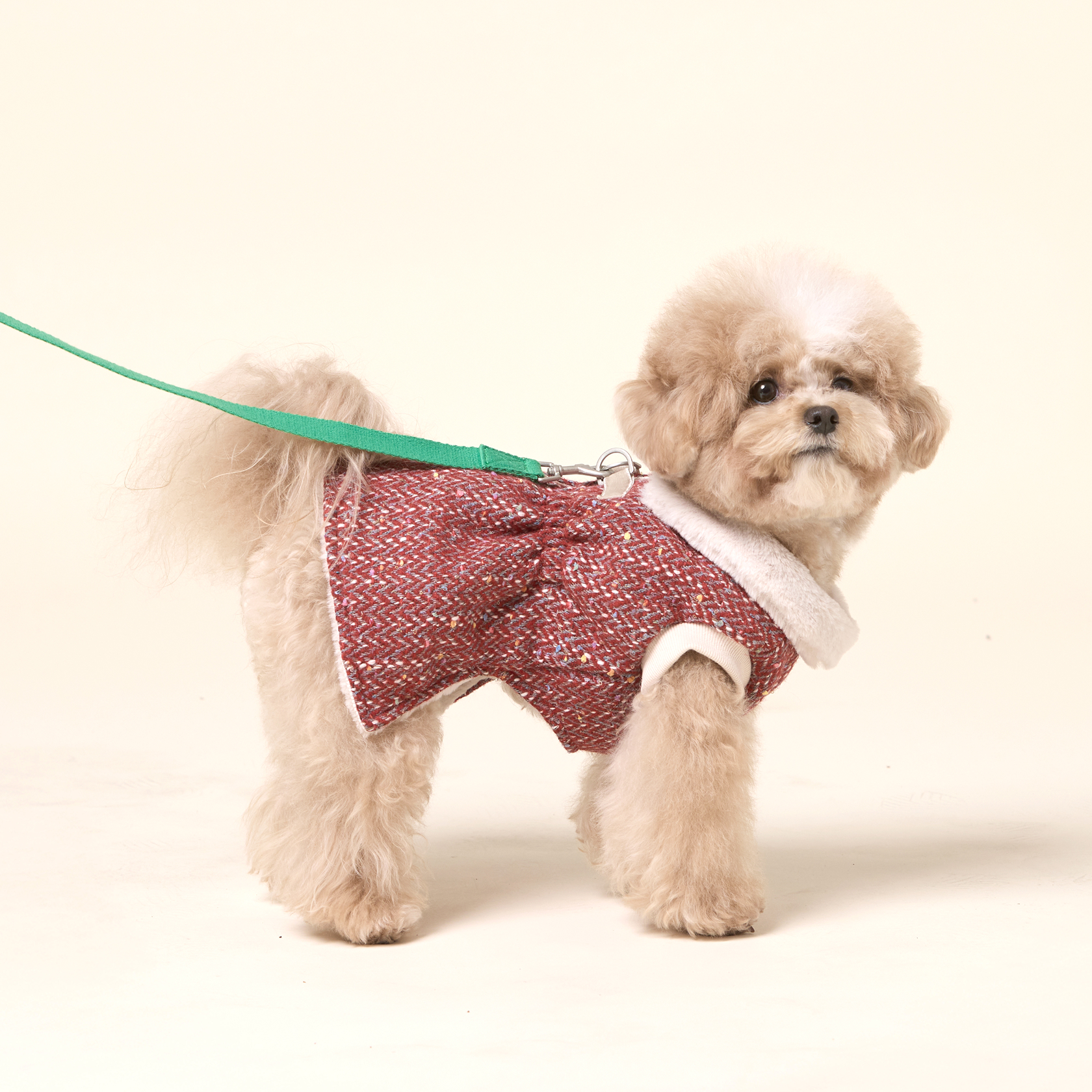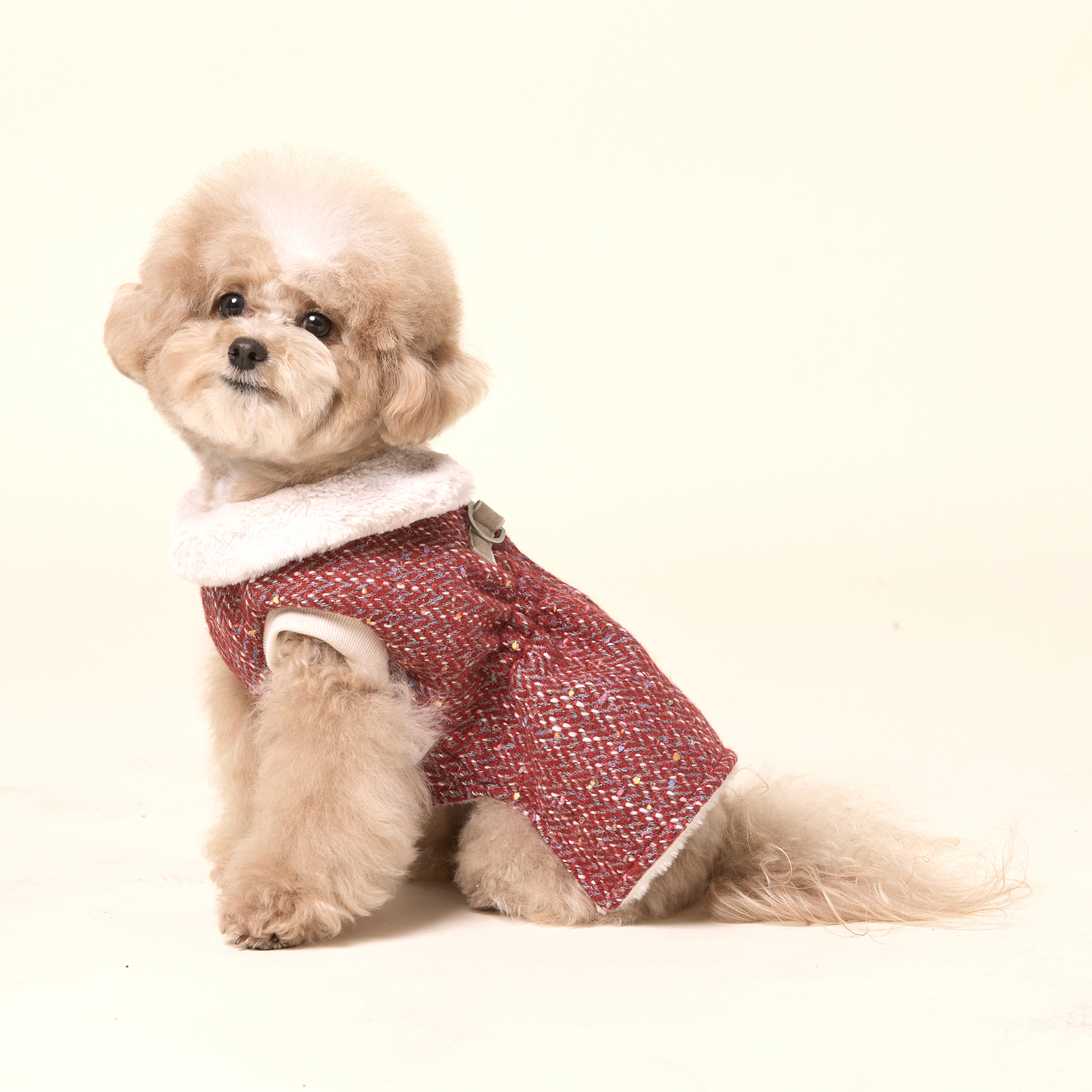 A harness-integrated coat combining a classic wool outer layer with a feather-soft eco-fur lining for both style and warmth.