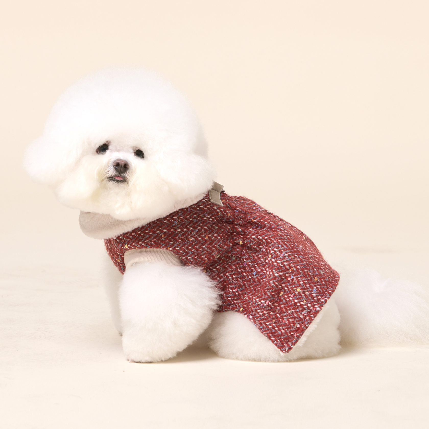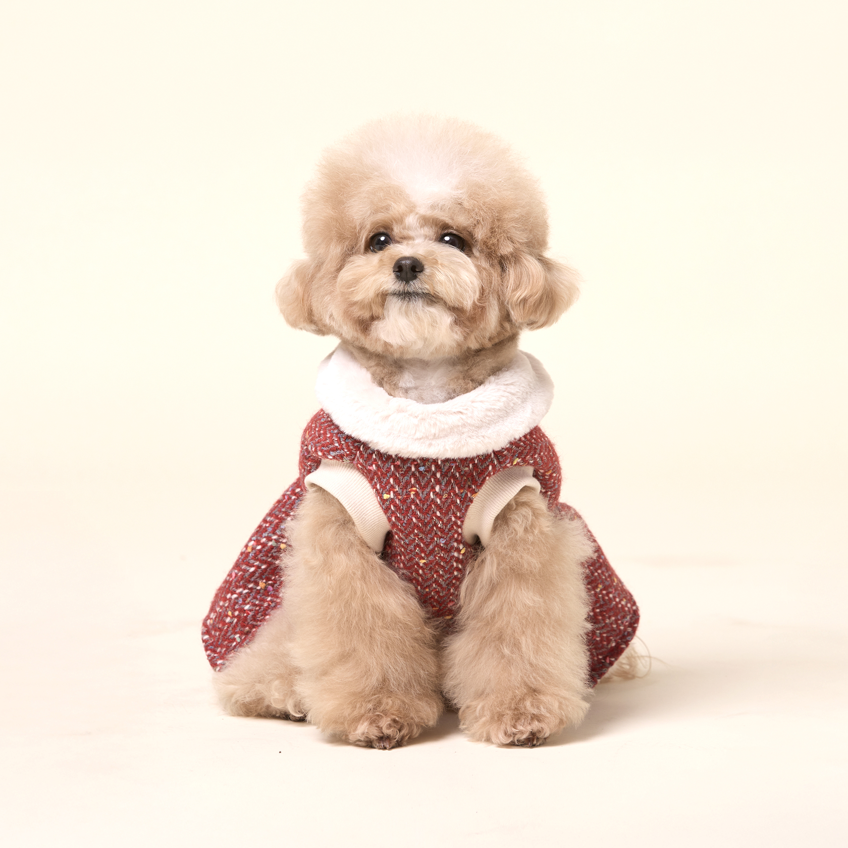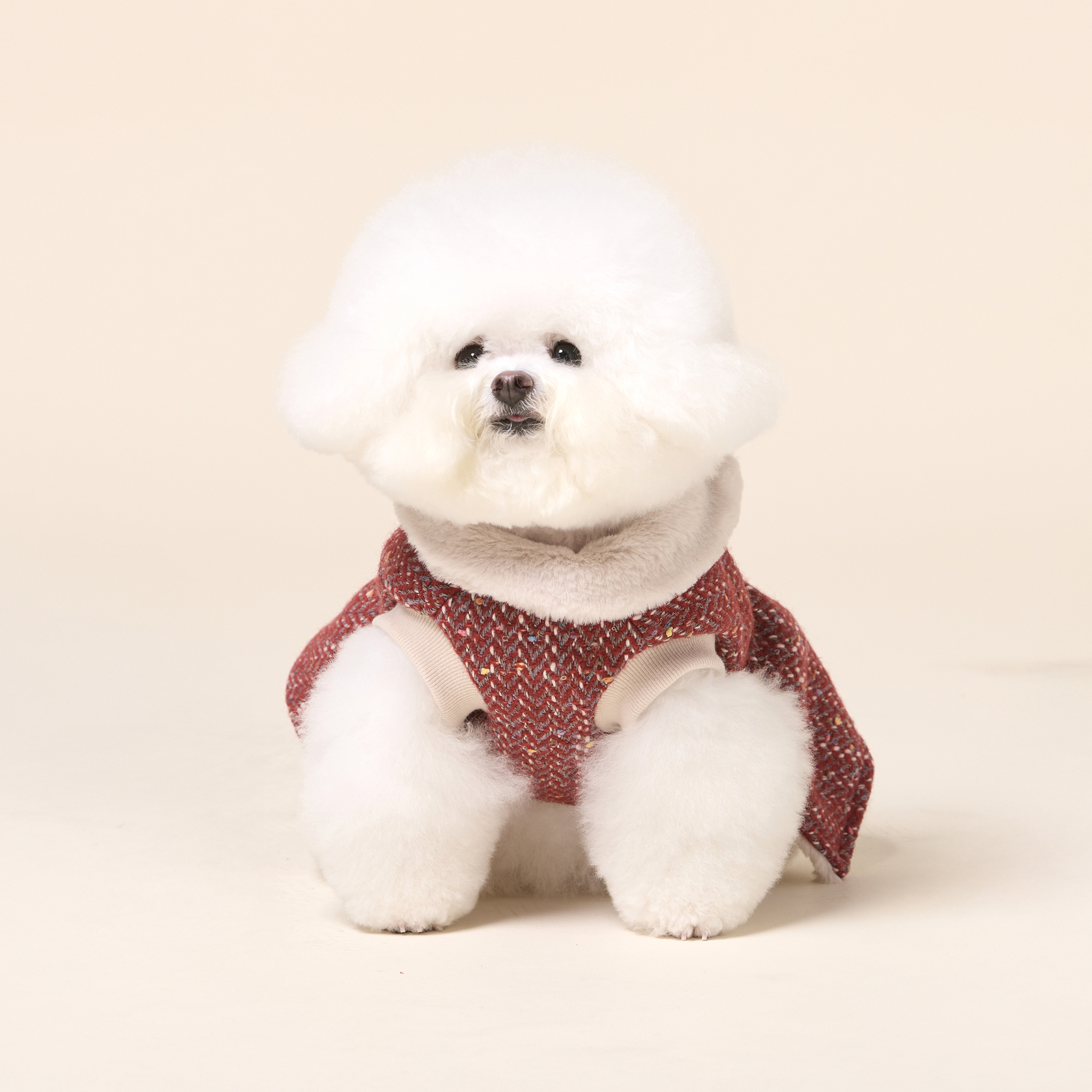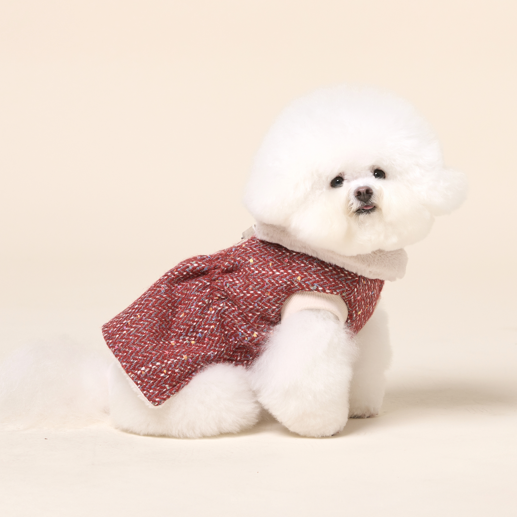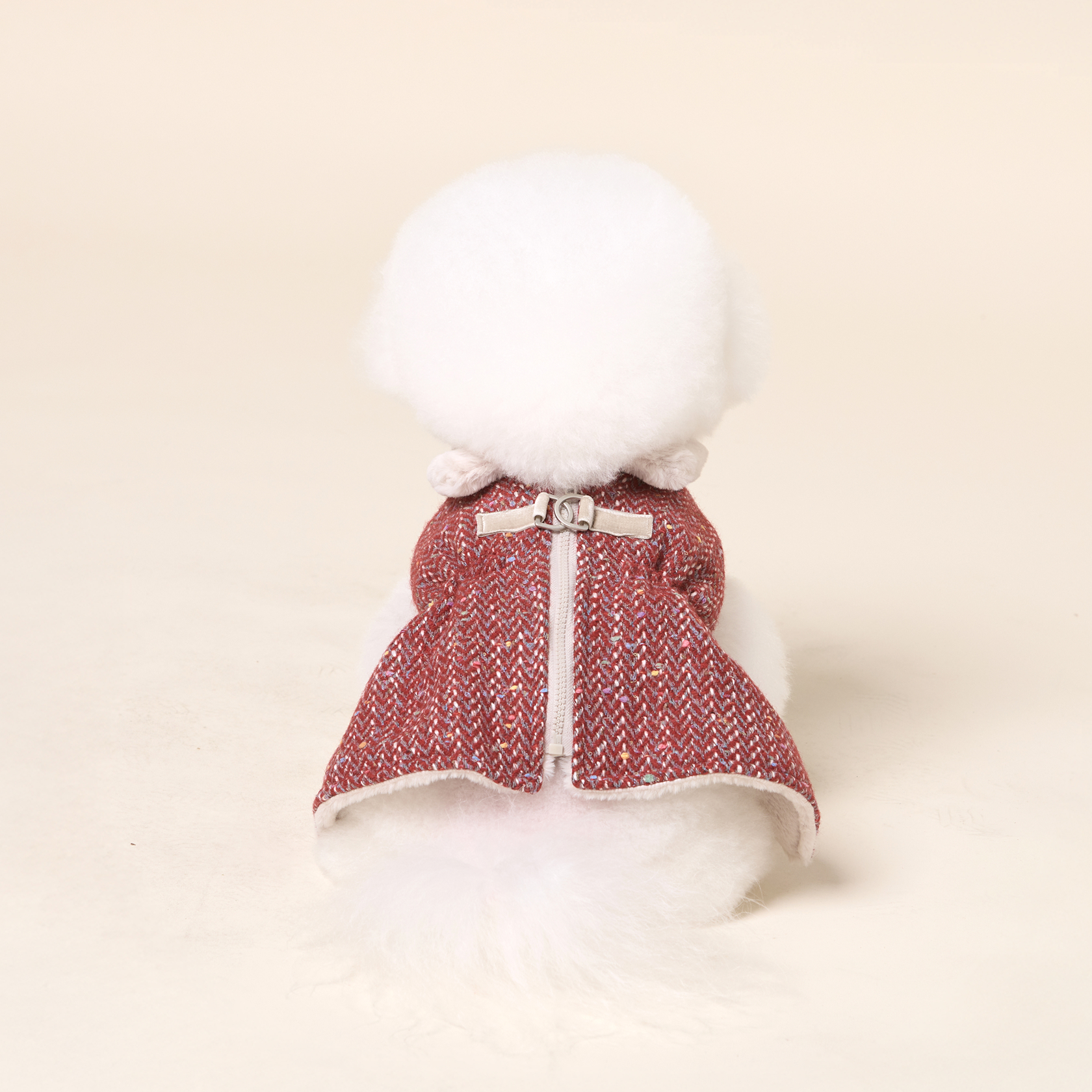 A harness-integrated coat combining a classic wool outer layer with a feather-soft eco-fur lining for both style and warmth.