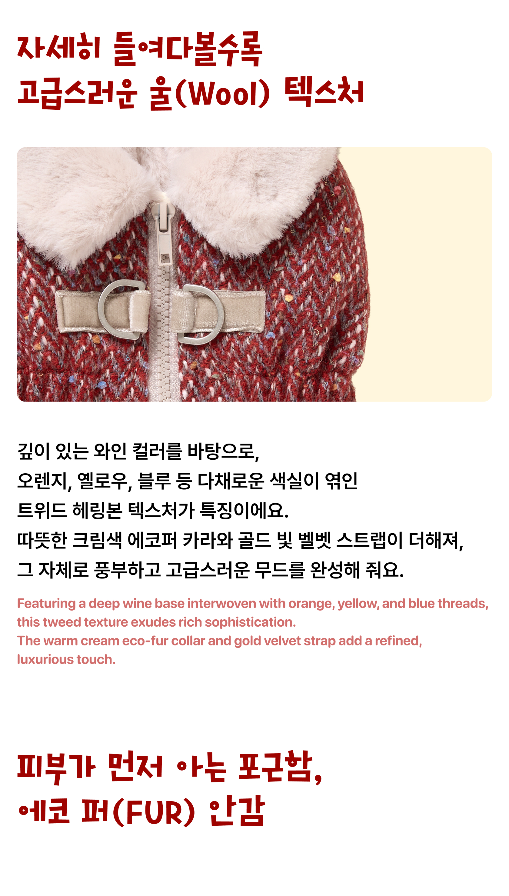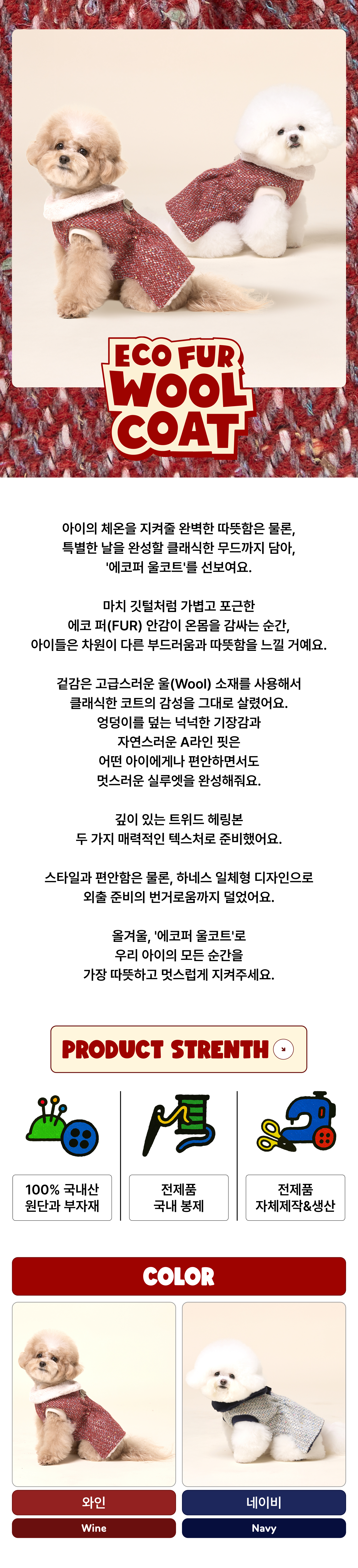 클래식한 울(Wool) 겉감과, 깃털처럼 부드러운 에코퍼 안감을 더해 스타일과 보온성을 모두 잡은 하네스 일체형 코트.