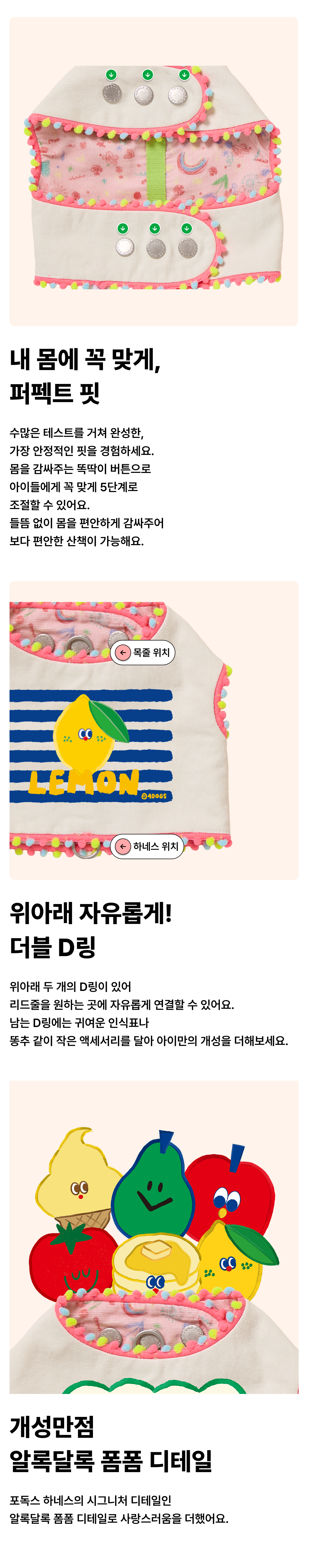 털 끼임 없는 5단계 똑딱이 버튼과 사랑스러운 폼폼 디테일이 특별함을 더합니다.